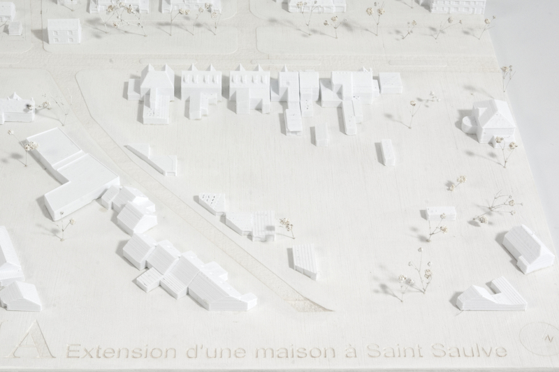 A l’extérieur, entre la maison et son extension se dégage une terrasse plutôt minérale. D’ici un chemin mène vers le jardin à côté et derrière l’extension qui comprendra une noue pour l’infiltration des eaux pluviales, des végétations de loisir et un potager. Sous la terrasse sera installée une grande cuve d’eaux pluviales et derrière l’extension, une noue d’infiltration.