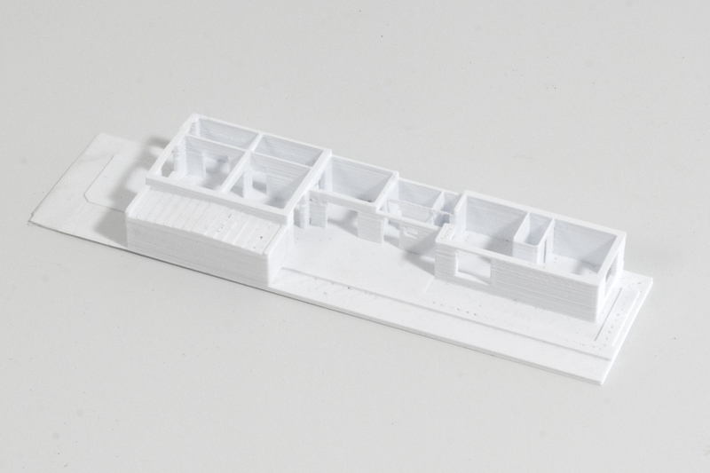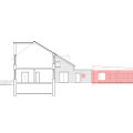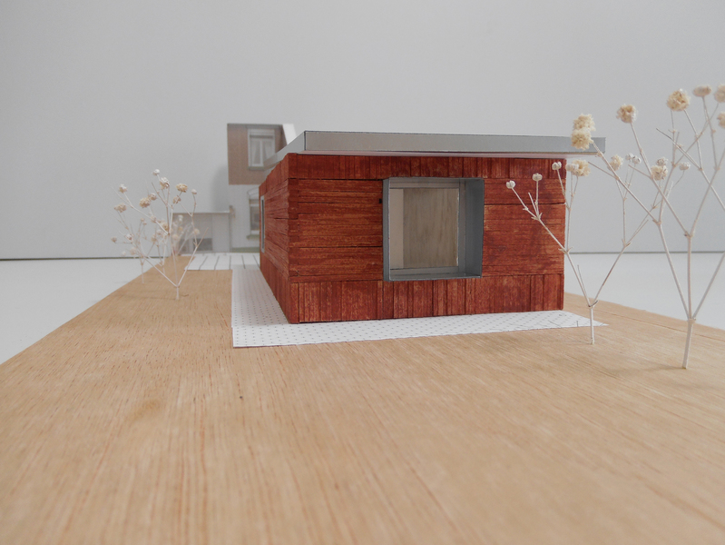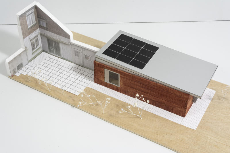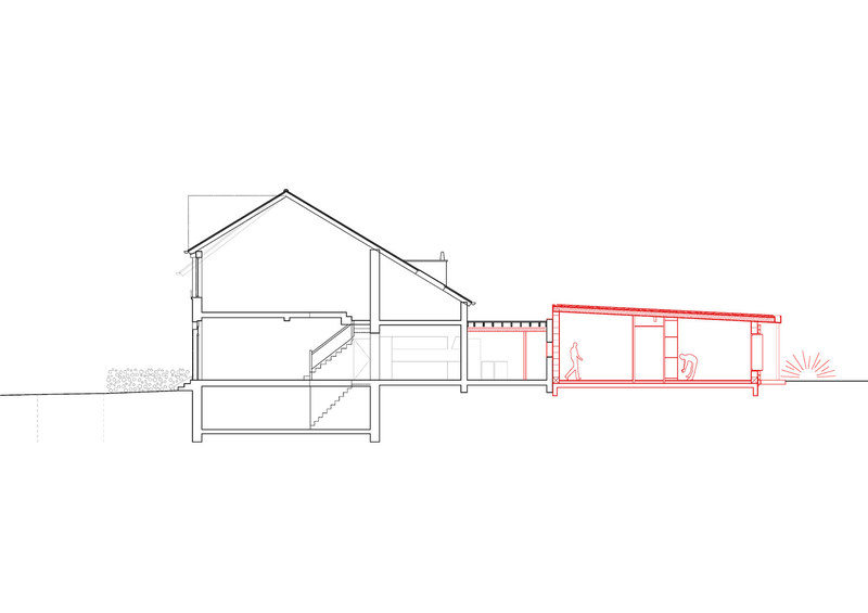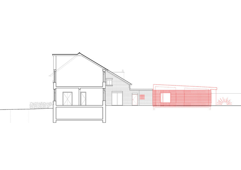 L’extension elle-même est construite en blocs de chanvre avec une bardage en briques. Une grande baie vitrée est disposée sur chacune des façades / dans chacune des pièces. La toiture est composée d’une charpente en panneaux bois et une couverture en bac acier surmontée de panneaux photovoltaïques.