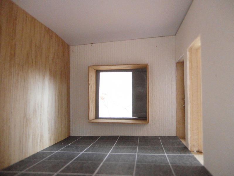 La seconde pièce sera la chambre à coucher. Les deux sont séparées par un grand « meuble » en bois qui intègre la salle de bains et des rangements.