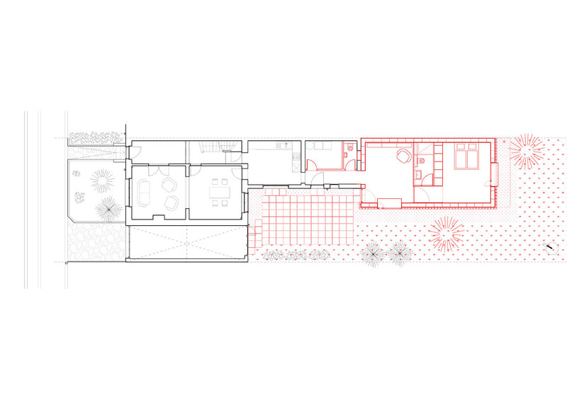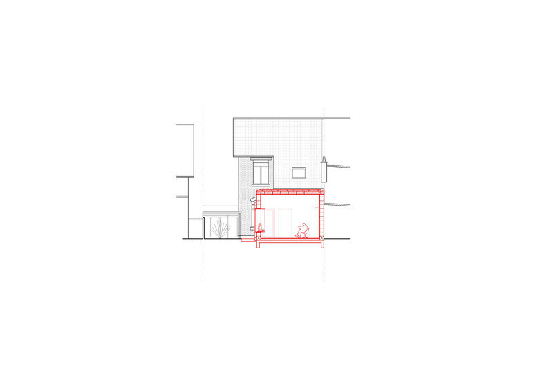 Le projet architectural ne modifie pas le corps principal de la maison, mais s’exprime par une extension du côté jardin. Cette dernière est située en limite de parcelle, en continuité avec les volumes existantes et en remplacement de la véranda.